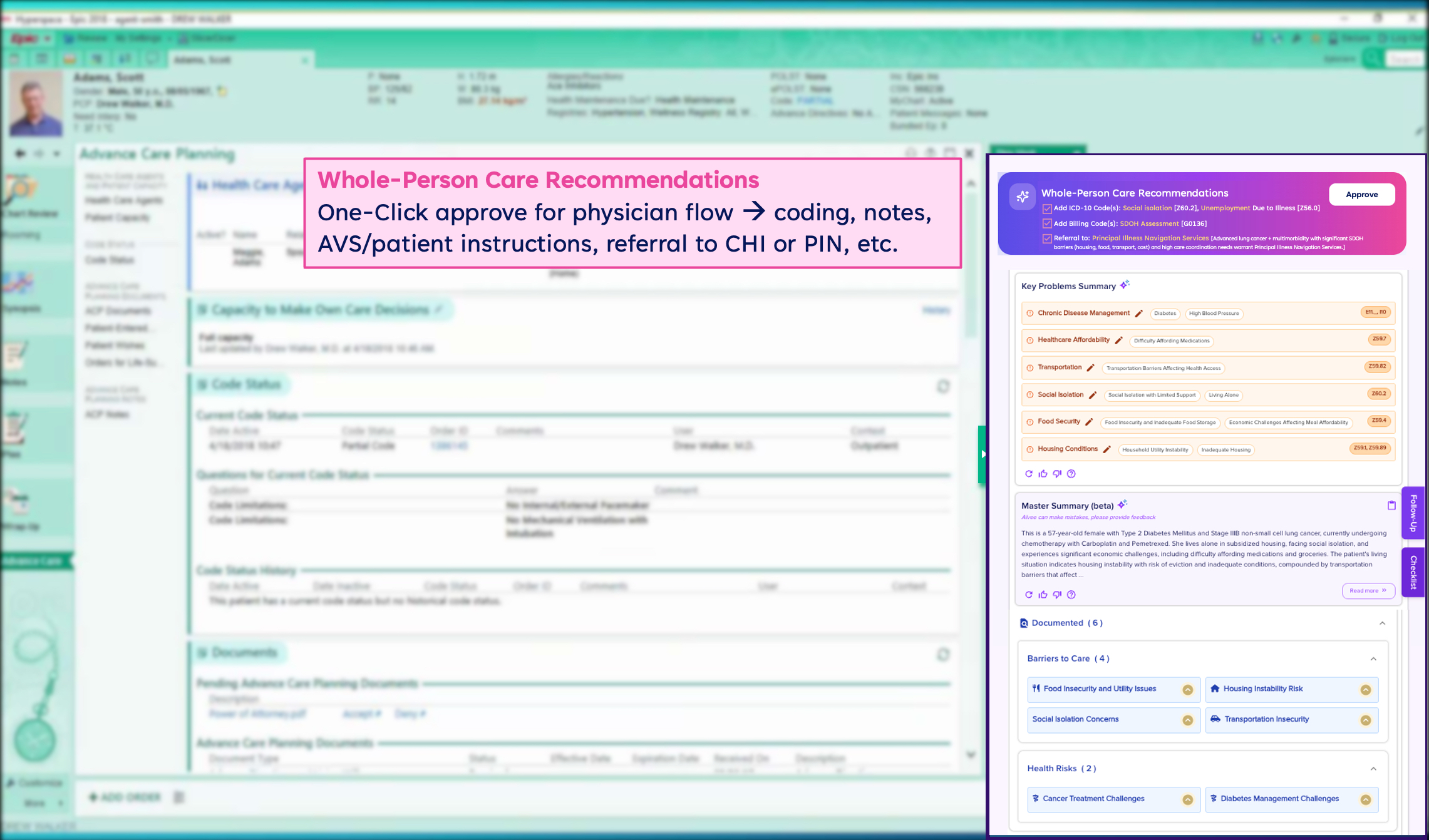 Suggests appropriate Z-codes, referrals for CHI/PIN, and auto-drafts billing-ready documentation